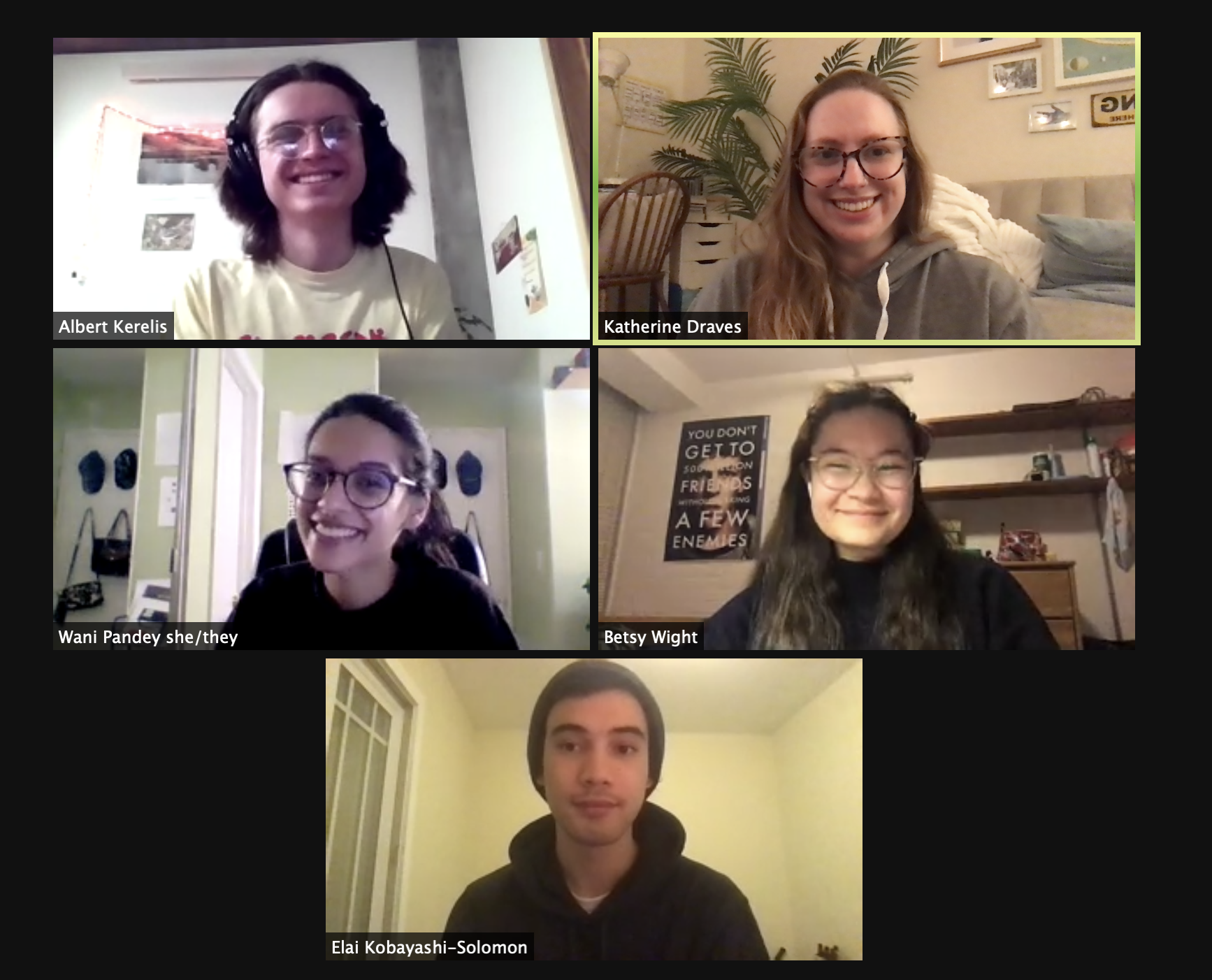 Katherine Draves ‘22, Albert Kerelis ‘24, Elai Kobayashi-Solomon ‘22, Wani Pandey ‘23, and Betsy Wight ‘23